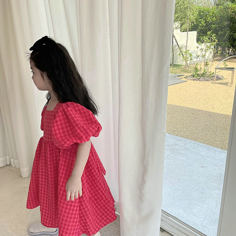 童装女童格子连衣裙夏季新款中小童韩版泡泡袖公主裙批发1173