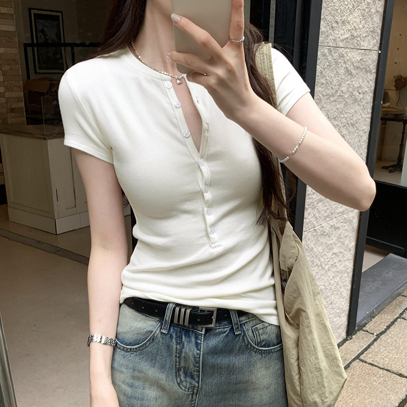 辣妹风气质款短袖正肩T恤女夏秋季新款爆款半开领修身显瘦上衣
