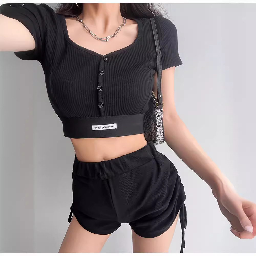美式辣妹紧身短袖T恤女超短款带胸垫打底衫露脐修身爵士运动上衣