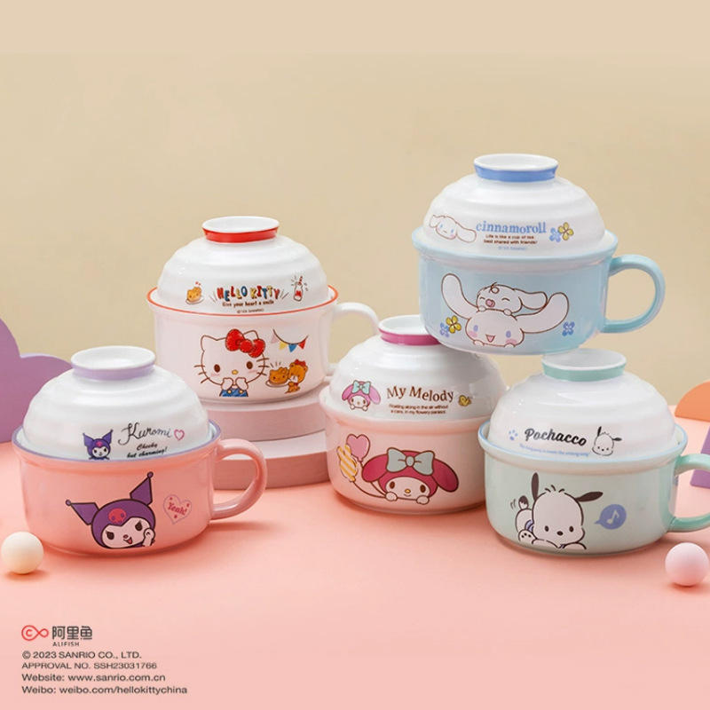 陶瓷泡面碗学生宿舍带盖带把饭盒可爱卡通手柄碗