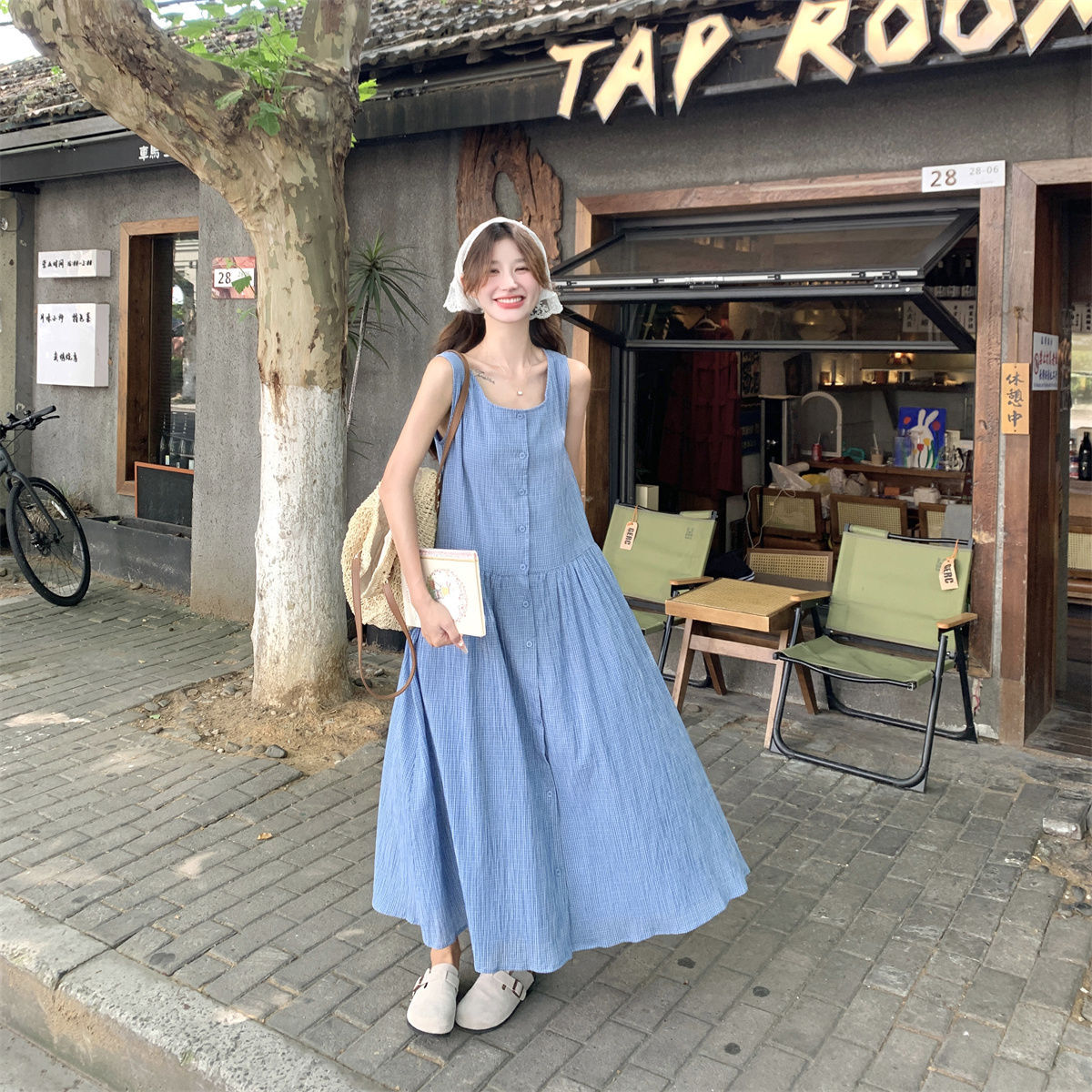 蓝色褶皱无袖背心连衣裙女夏季韩系气质简约单排扣慵懒风长裙