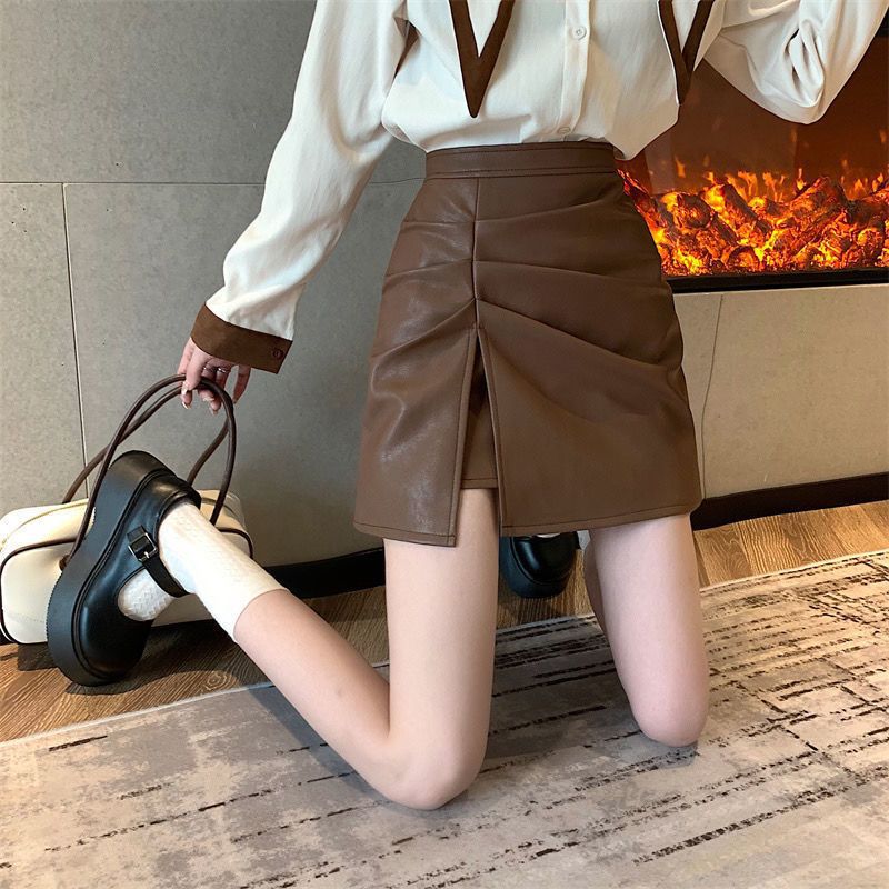 开叉褶皱PU小皮裙女显瘦半身裙高腰防走光遮胯a字裙包臀短裙子女