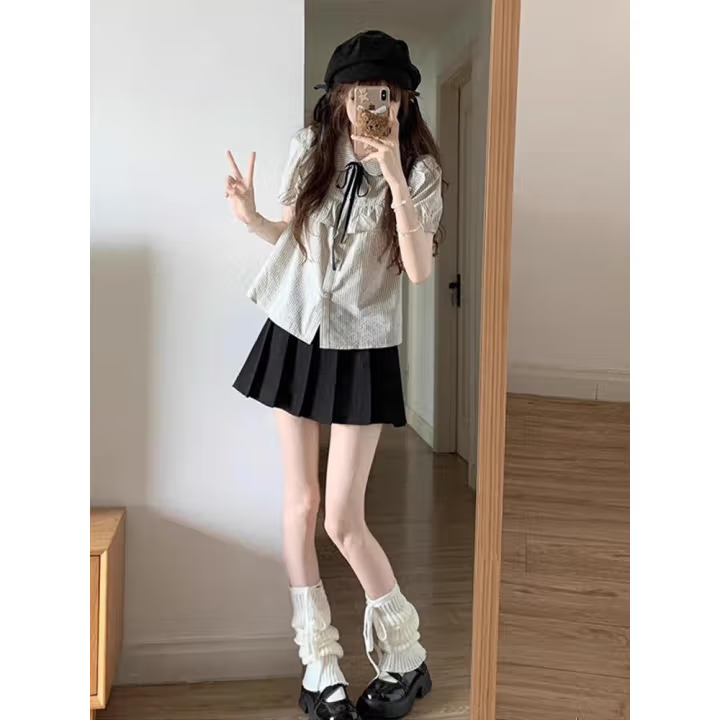 甜美学院风套装女夏娃娃领荷叶边条纹短袖衬衫半身裙短裙