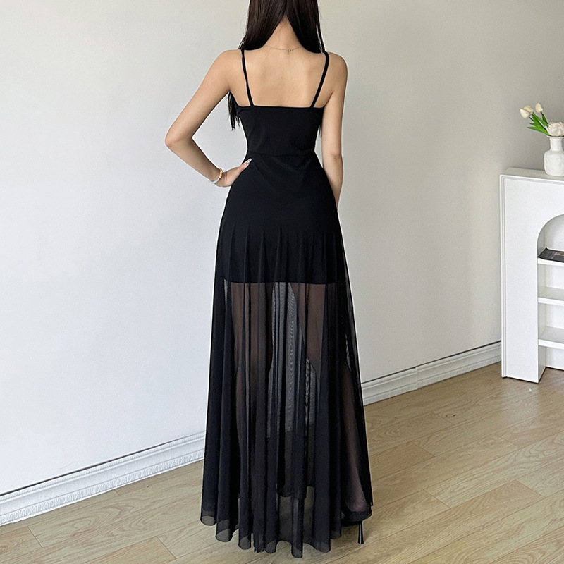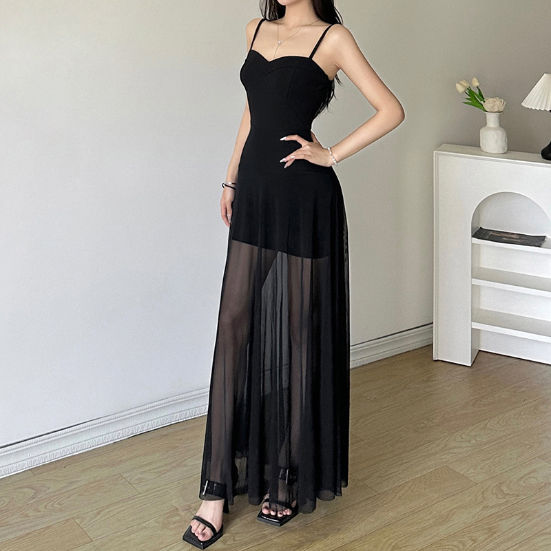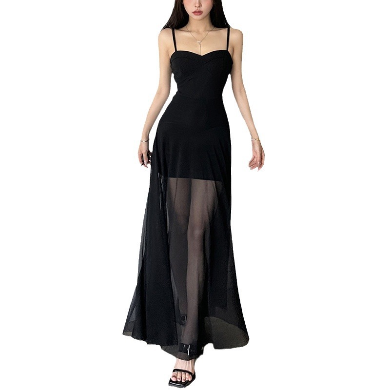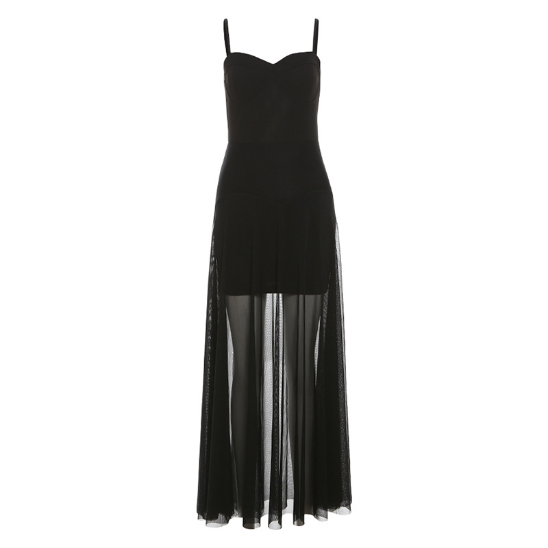 欧美风夏季新款女装纯欲裹胸网纱拼接收腰超大摆连衣裙