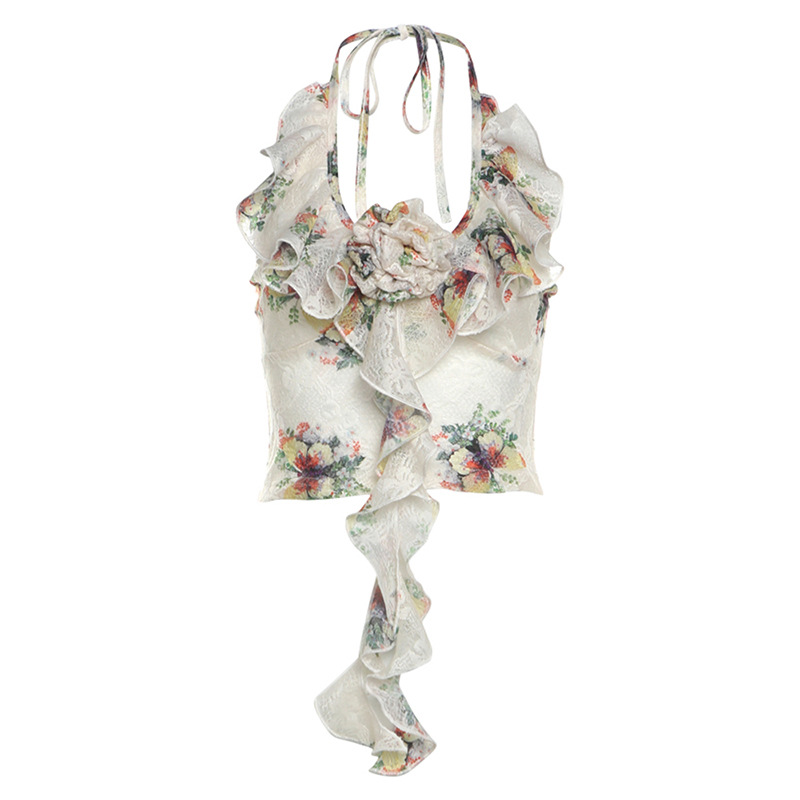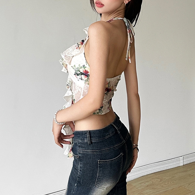 欧美风夏季新款女装系带挂脖小清新印花露脐木耳边小背心