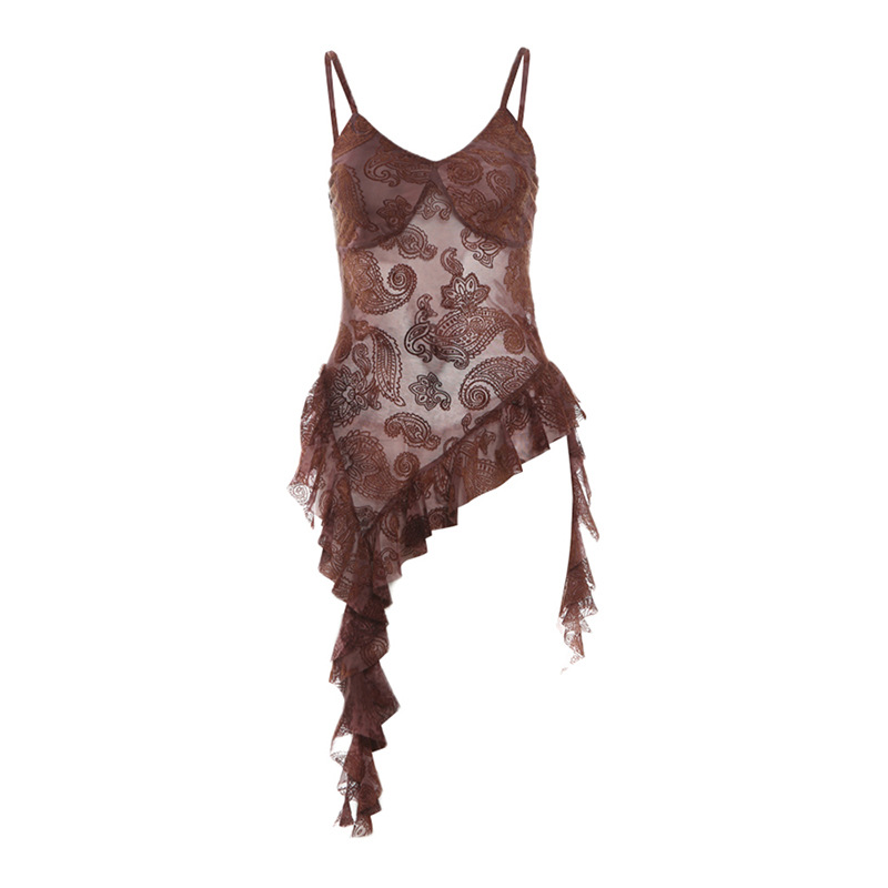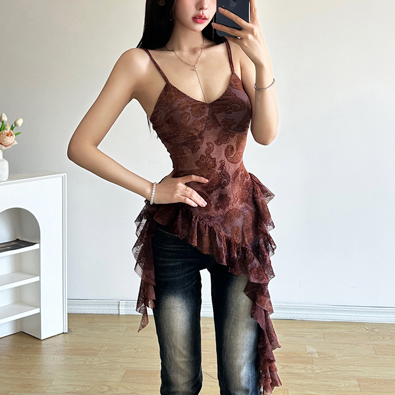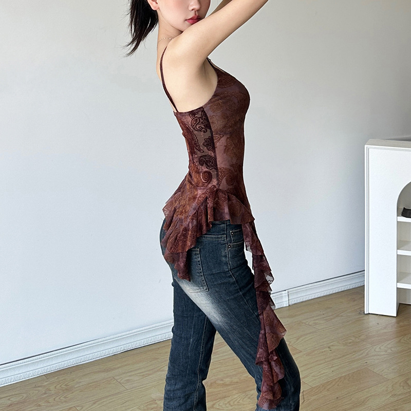 欧美风夏季新款女装独特荷叶边设计花卉图案吊带小背心