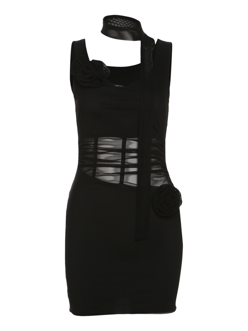 欧美风夏季新款女装纯色修身高腰时尚V领吊带纱网连衣裙