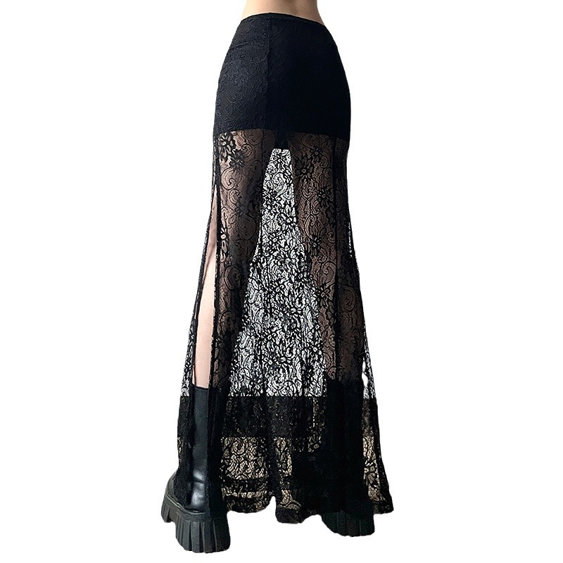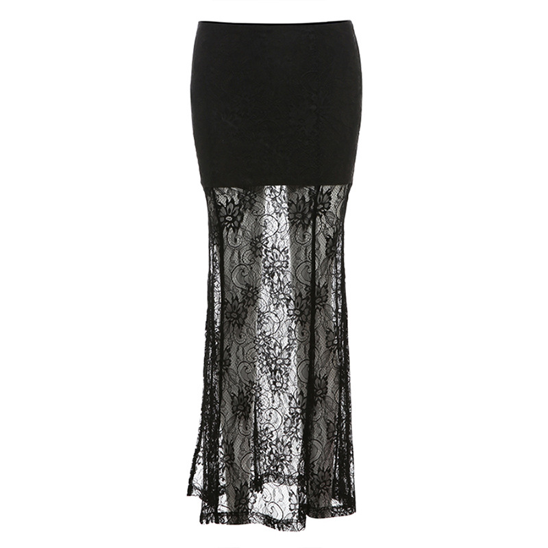 欧美风夏季新款女装时尚黑色蕾丝透视显瘦拖地长裙半身裙