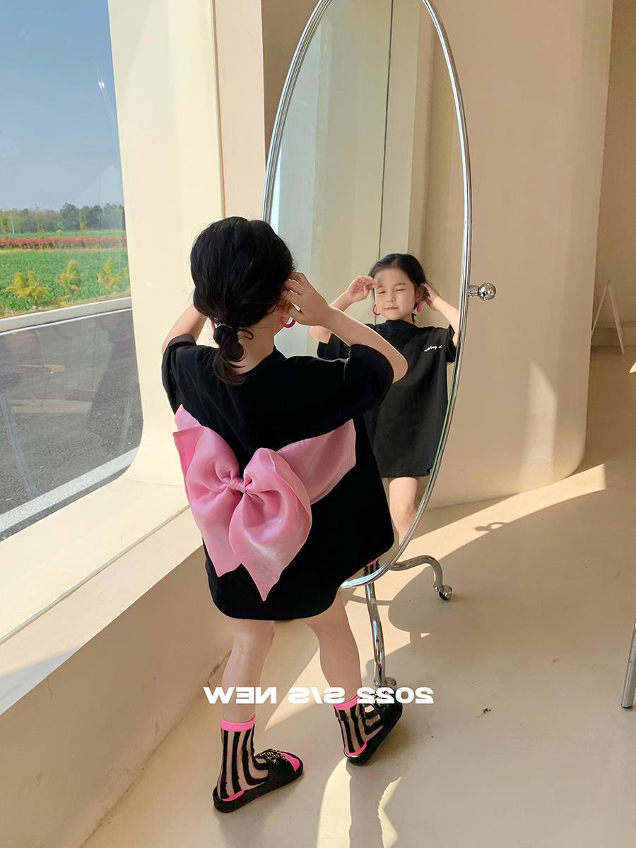 女童短袖黑色T恤连衣裙2025新款夏季设计感蝴蝶结宝宝洋气裙子潮