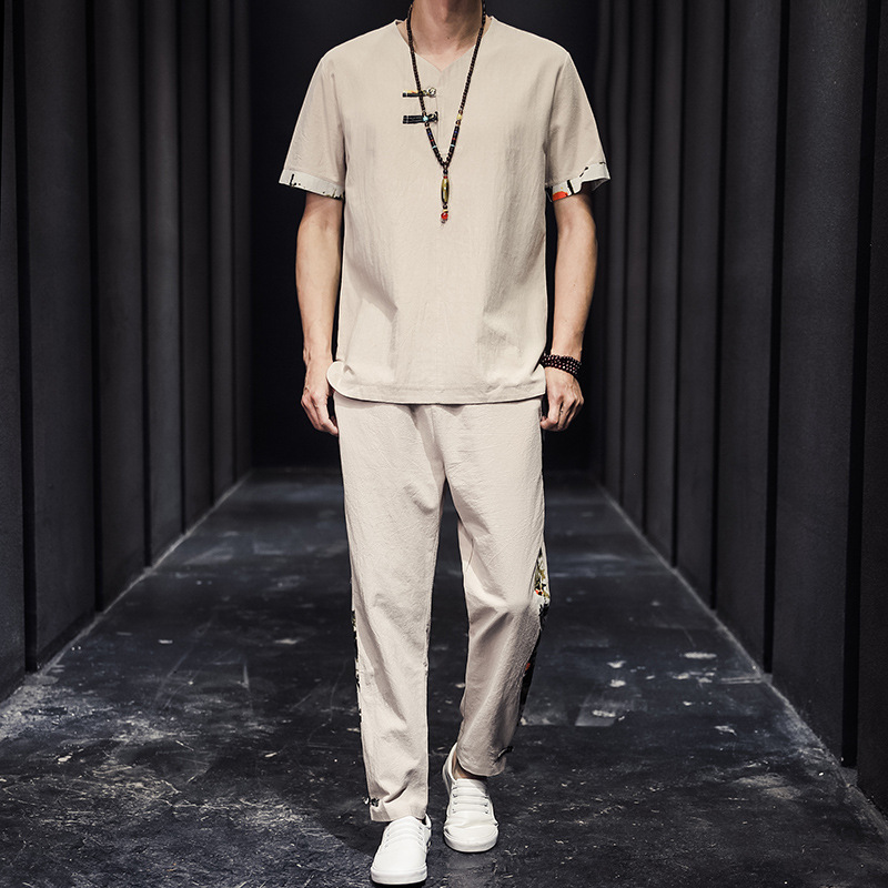 夏季新款中国风棉麻亚麻短袖T恤唐装大码男士盘扣套装