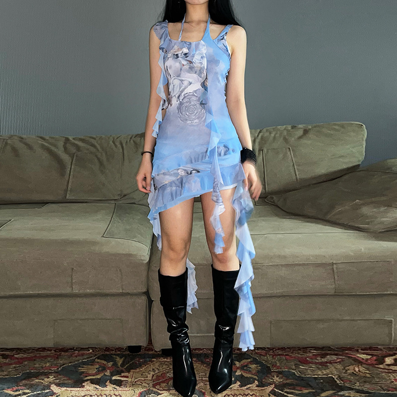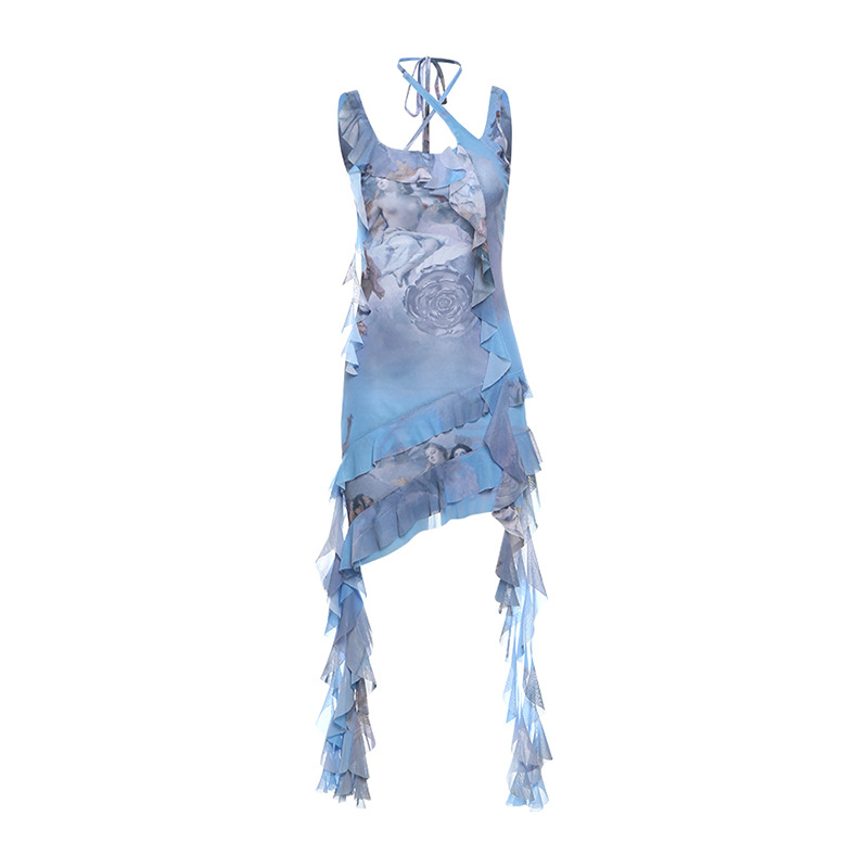 欧美风夏季新款女装法式复古印花吊带不规则边包臀连衣裙