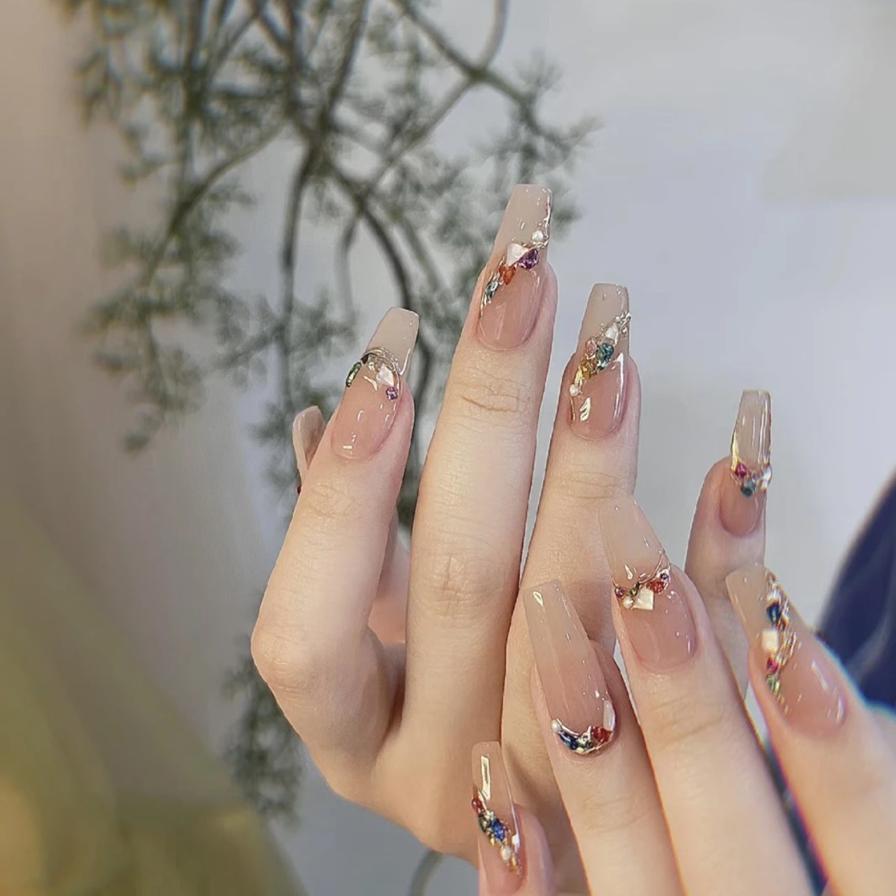 手工穿戴甲巴洛克珍珠奶茶裸色手工光疗甲可拆卸碎钻美甲款穿戴甲