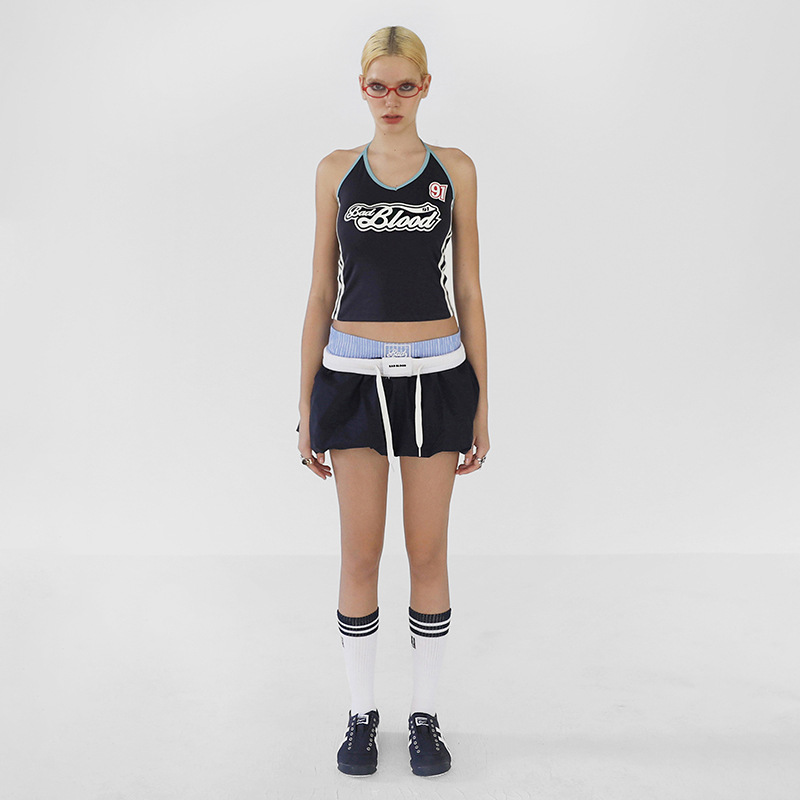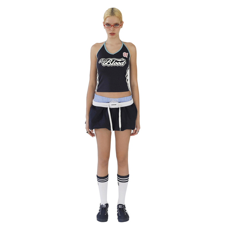 跨境欧美风夏季新款女装美式街头系带挂脖字母印花露脐小背心