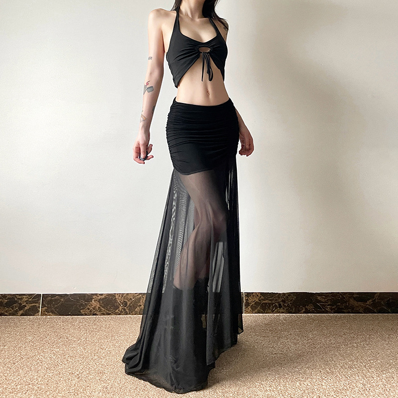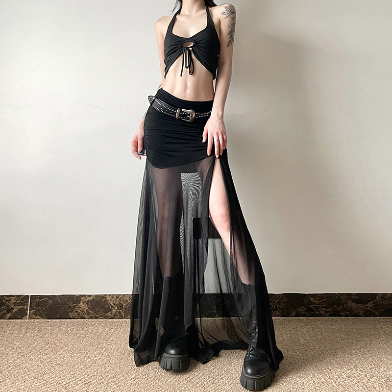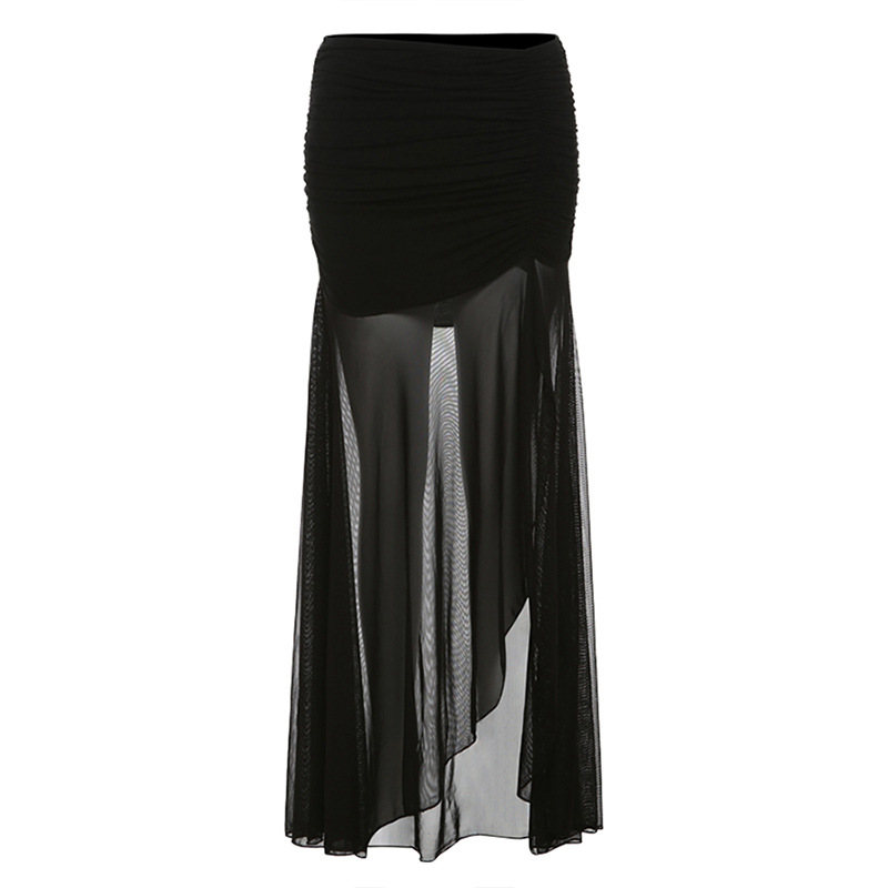 跨境欧美风夏季新款女装性感时尚黑色网纱透明开衩长裙半身裙