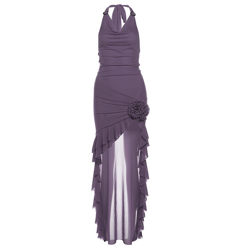 跨境欧美风夏季新款女装纯色性感辣妹挂脖修身束腰网纱连衣裙