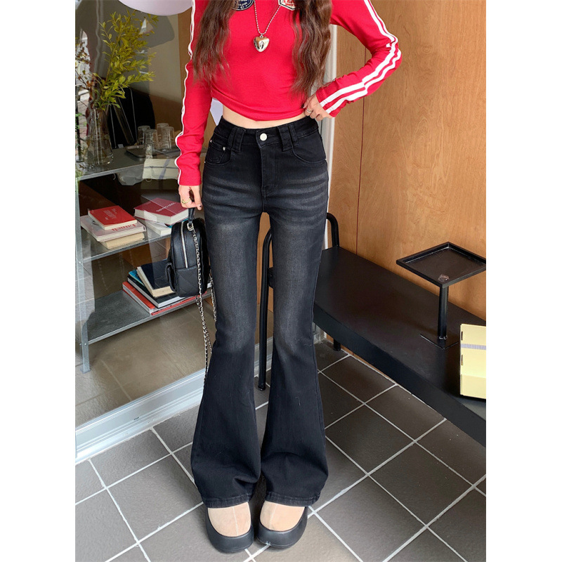 美式复古黑色高腰微喇牛仔裤女修身拖地微喇叭长裤