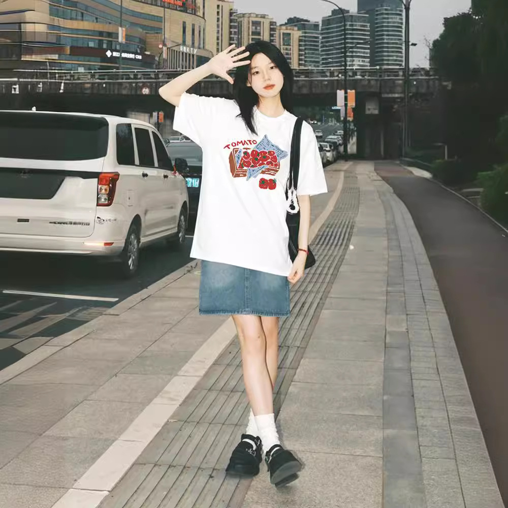 大码设计感印花短袖女纯棉时尚显瘦上衣夏季遮肉百搭白色T恤