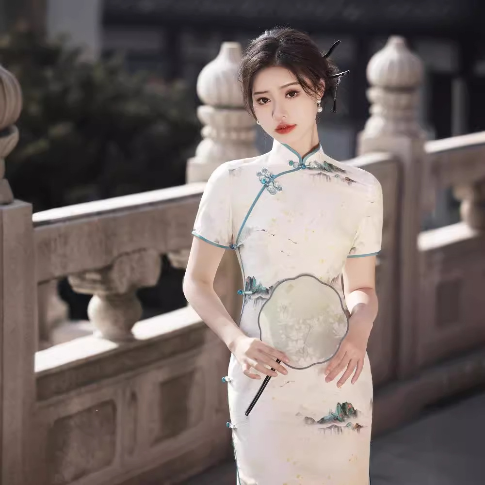 年轻款旗袍新款新中式民国风千里江山立领改良款旗袍