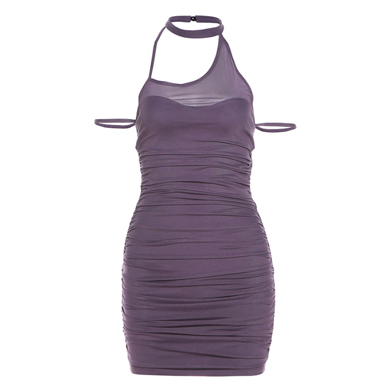 跨境欧美风夏季新款女装辣妹挂脖抽褶修身收腰包臀纯色连衣裙