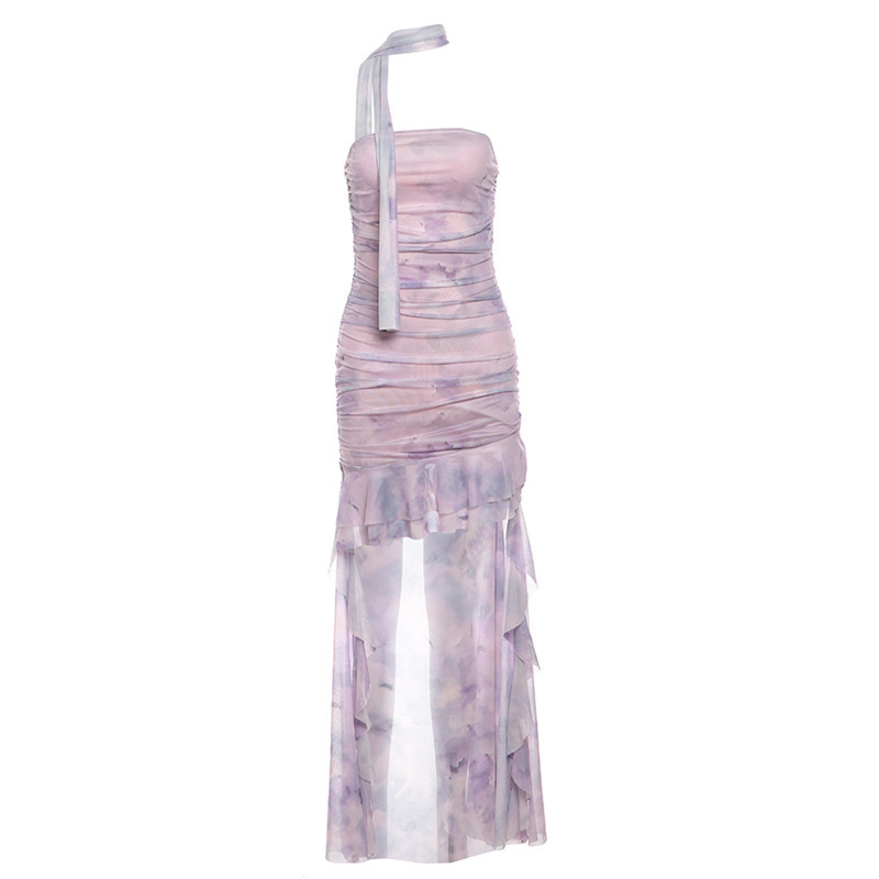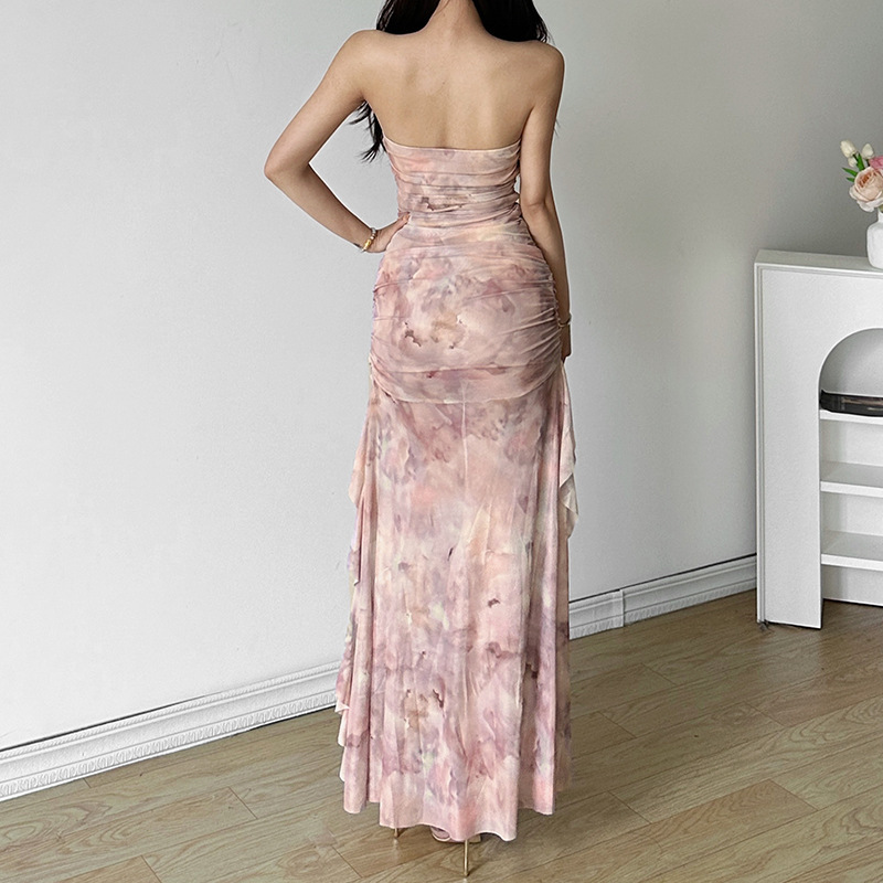 跨境欧美风夏季新款女装印花修身高腰时尚一字领抹胸连衣裙