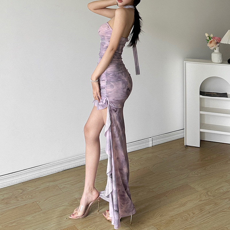 跨境欧美风新款女装多层次褶皱设计透视蕾丝修身连衣裙