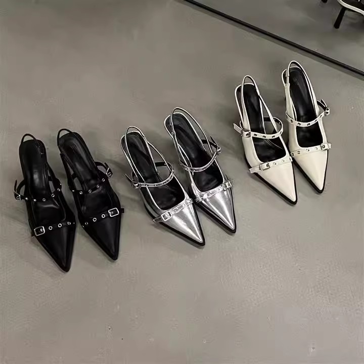 春夏新款尖头高跟铆钉凉鞋后空浅口铆钉时尚百搭细跟浅口女鞋