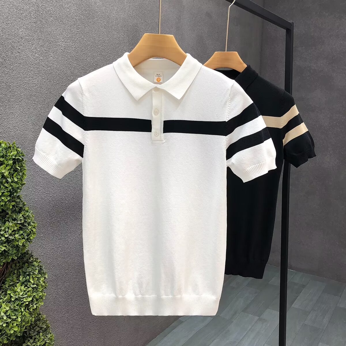 2025简约条纹撞色针织T恤冰丝POLO衫男休闲百搭弹力透气带领体恤