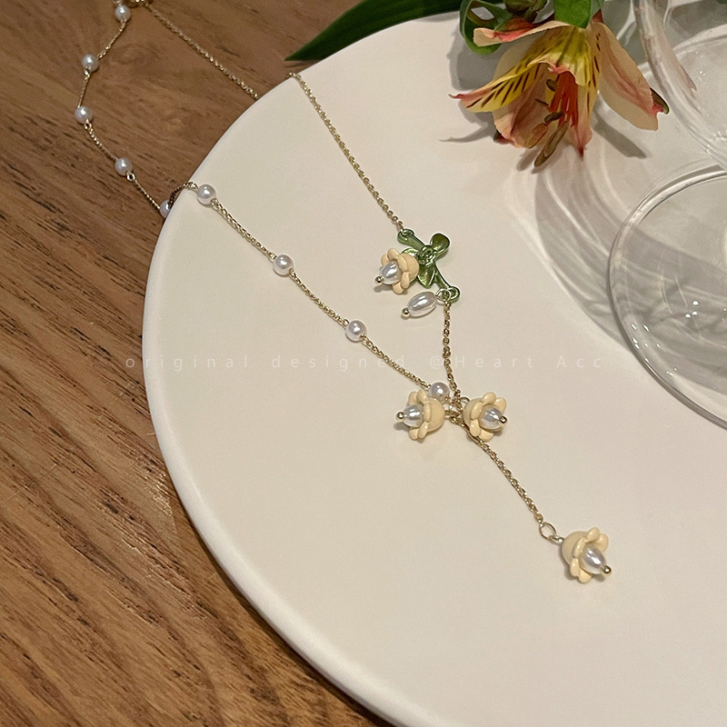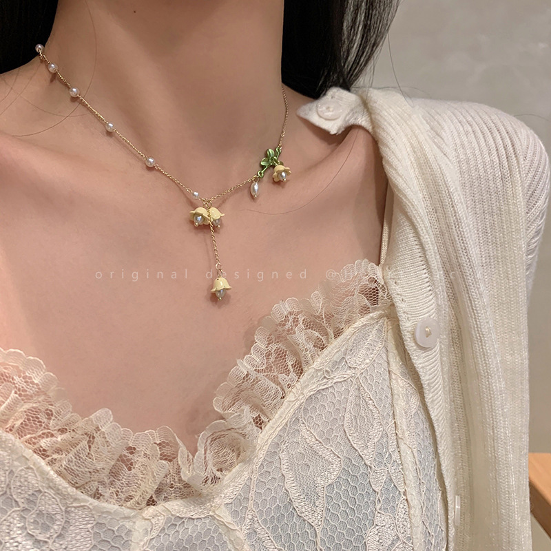 日韩ins风合金铃兰花仿珍珠项链 年新款女个性吊坠流苏锁骨链
