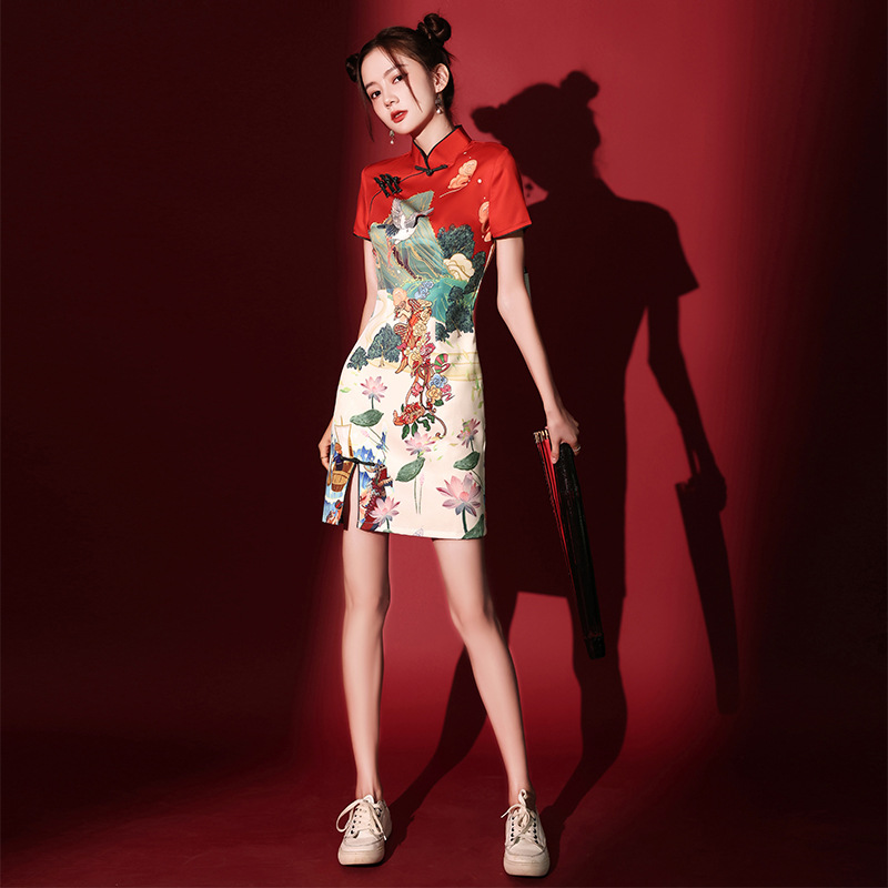 国潮旗袍裙新款女炸街短款改良红色年轻款伴娘服中国风女装