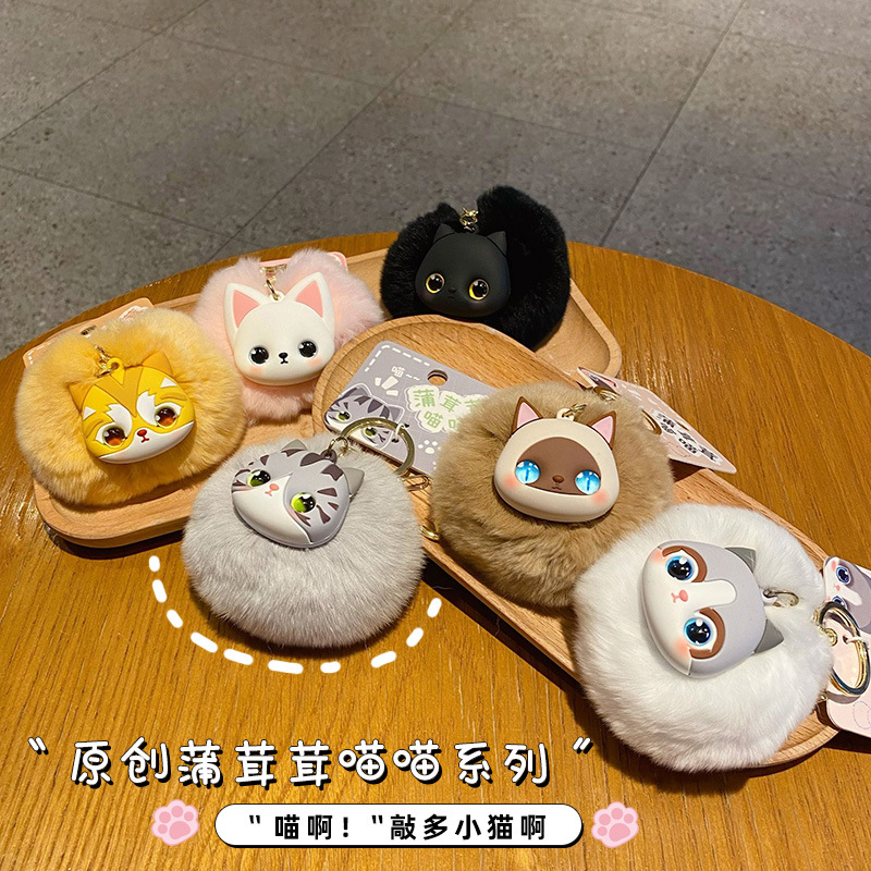 卡通蒲茸茸喵喵汽车钥匙扣毛绒猫咪车用挂饰创意毛球精致车载挂件