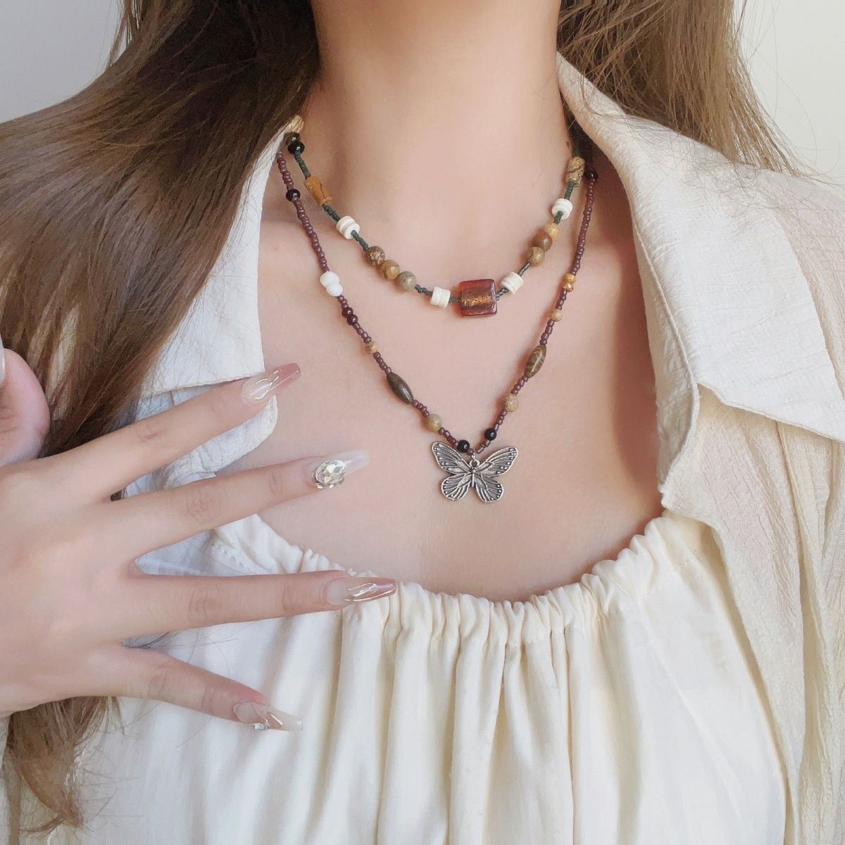 新中式项链复古串珠蝴蝶项链女轻奢小众设计感内搭禅意锁骨链配饰