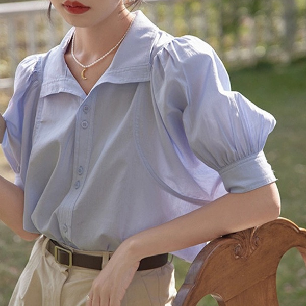 夏季法式气质泡泡袖雪纺衬衣女复古短袖衬衫设计感小众别致上衣薄
