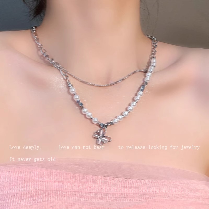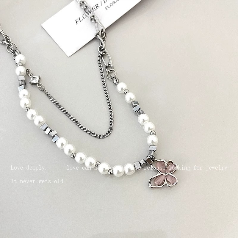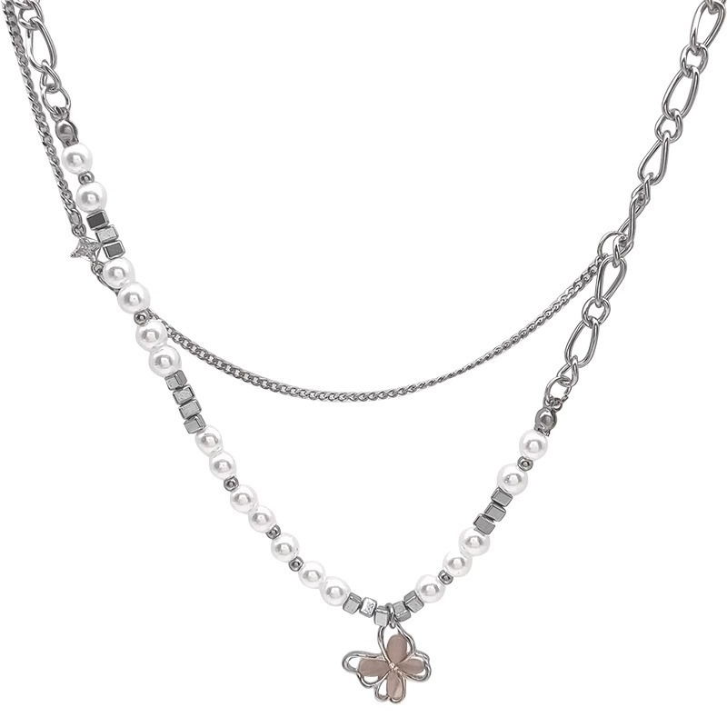 双层珍珠粉色蝴蝶吊坠项链女轻奢小众设计草莓晶个性甜酷锁骨链子