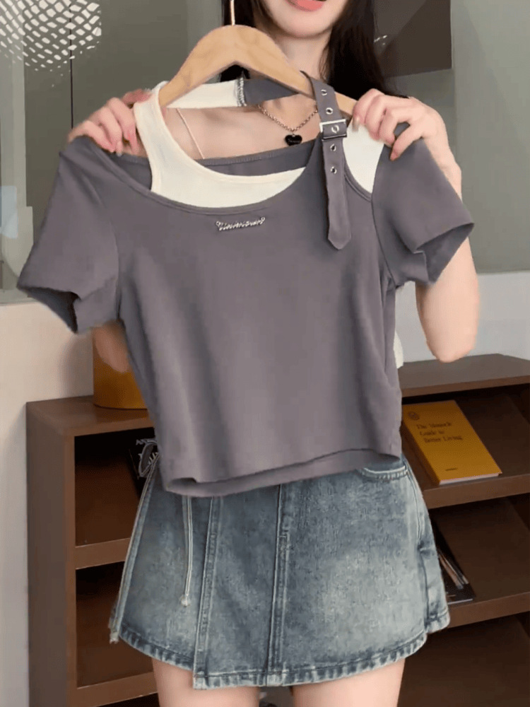 大码女装夏季假两件正肩短袖T恤微胖mm美式小衫短款挂脖辣妹上衣