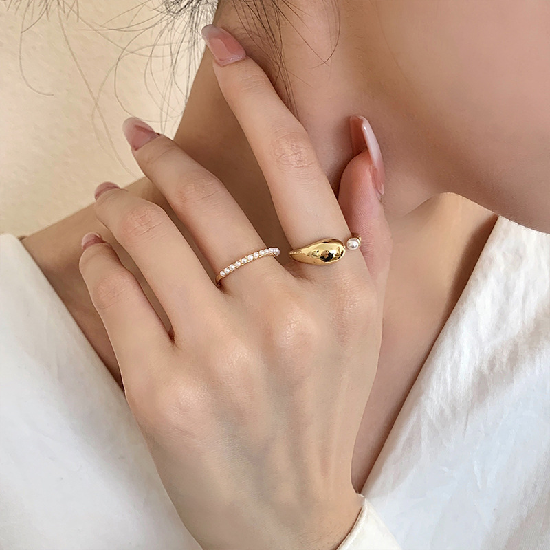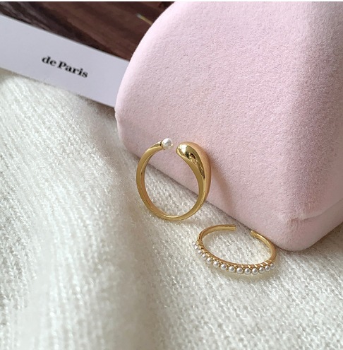 真金电镀珍珠开口戒指2件套简约气质百搭素圈食指戒个性手饰