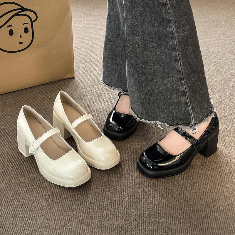 玛丽珍粗跟单鞋女早春新款法式复古高跟鞋一字带浅口仙女鞋