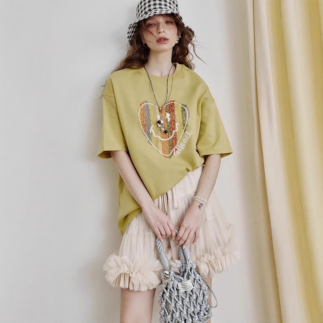 重工彩虹爱心刺绣短袖t恤女2025春新款设计感休闲上衣
