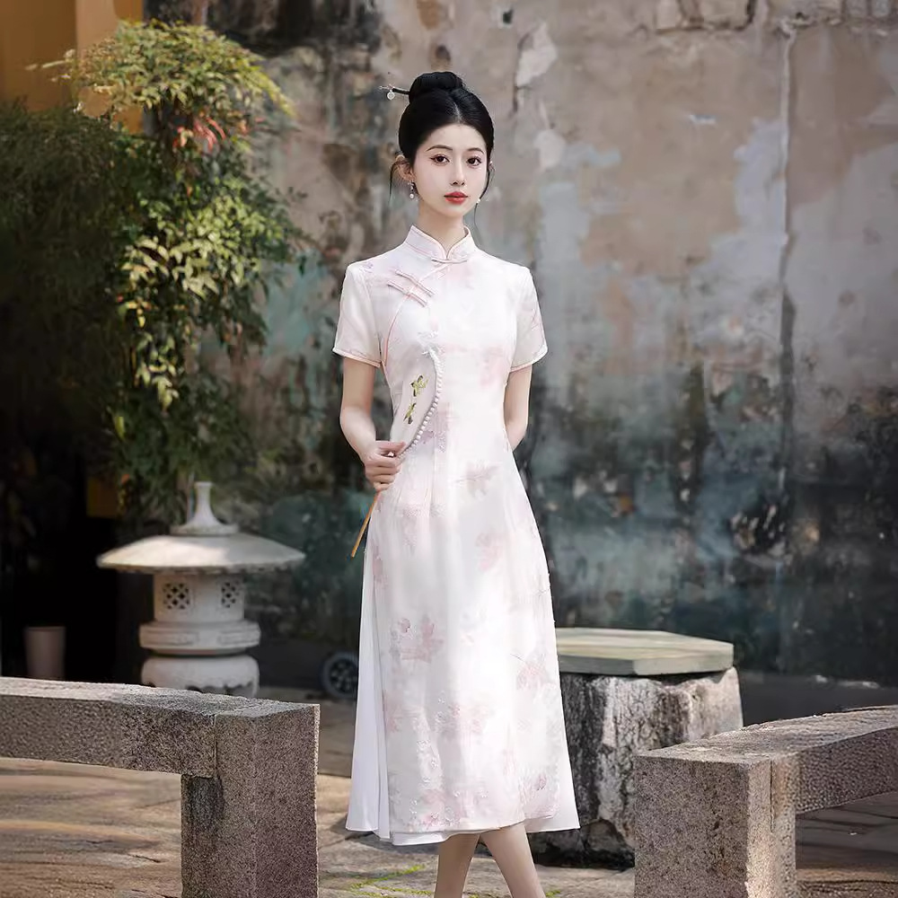 新款旗袍改良年轻款粉色小个子日常素雅遮肚子微胖复古中式连衣裙