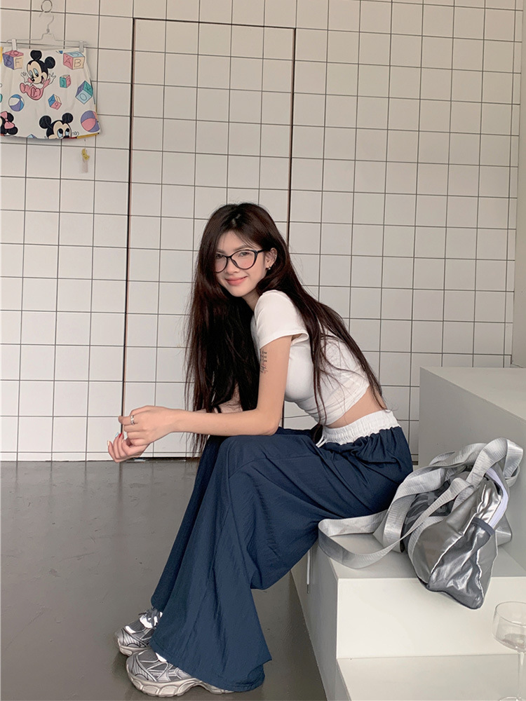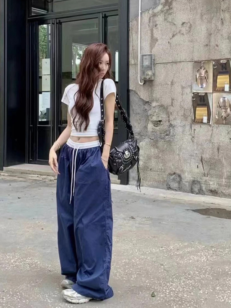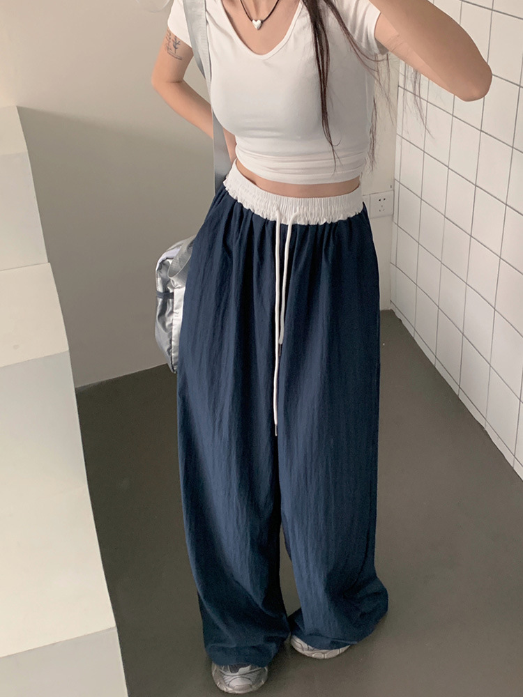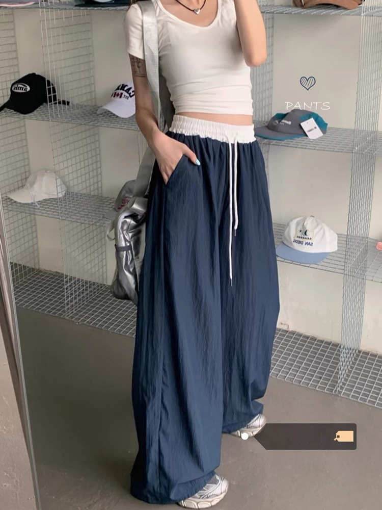 撞色松紧腰阔腿裤女夏季薄款新款速干宽松休闲垂感直筒山本裤