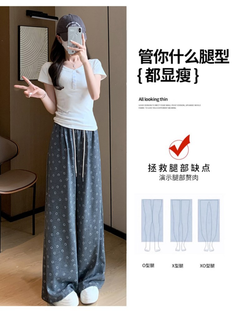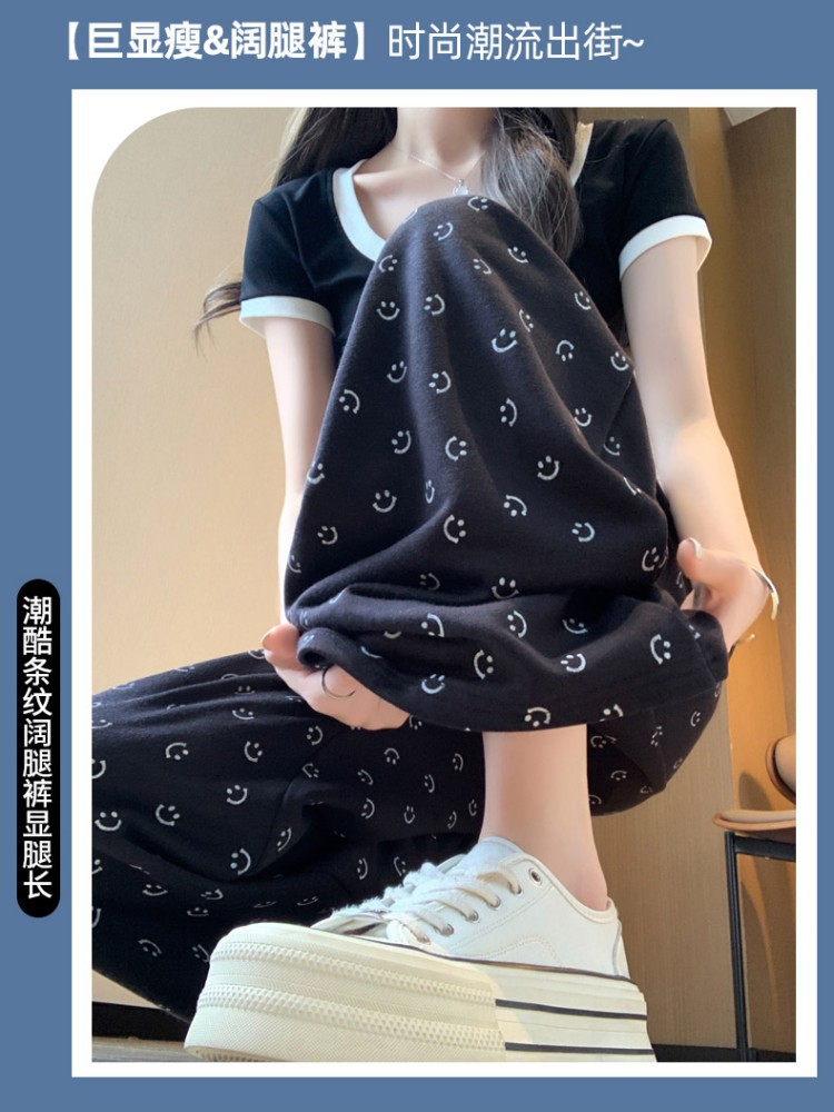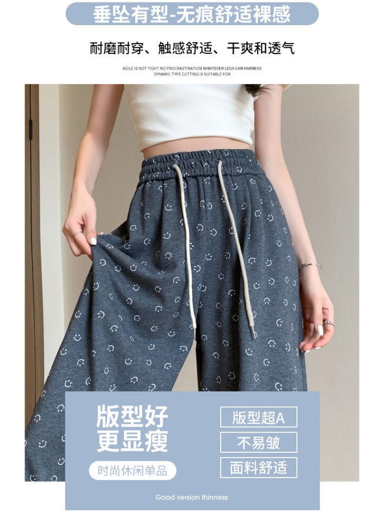 慵懒风笑脸印花复古拖地阔腿裤女春秋宽松垂坠感直筒显瘦休闲裤子