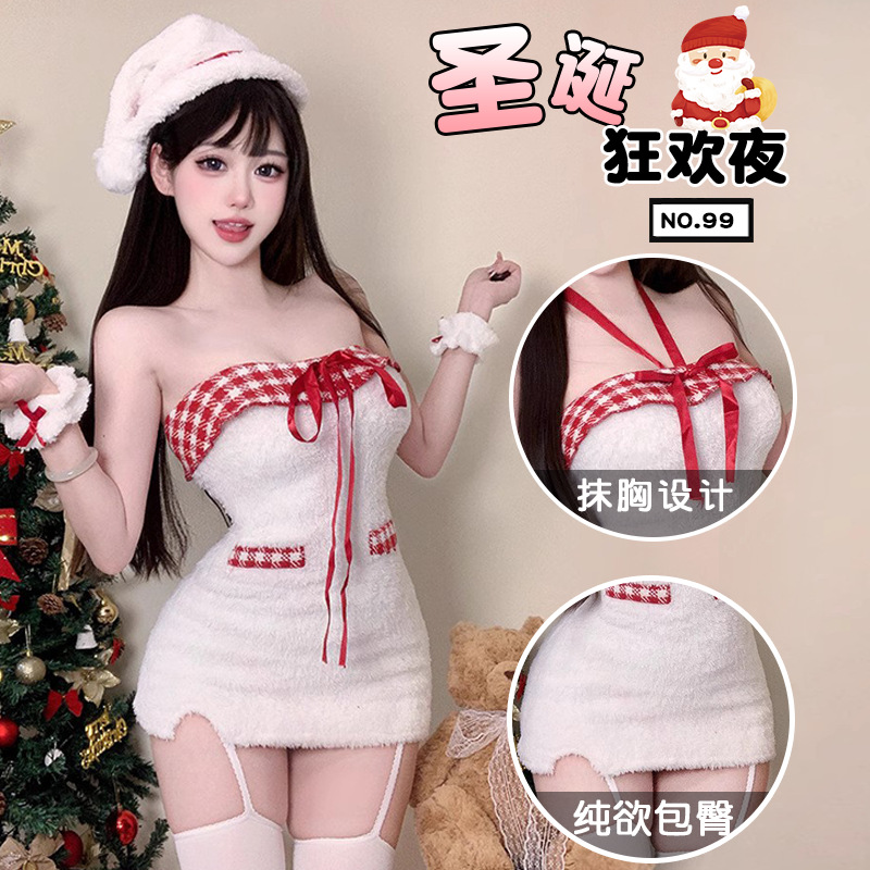 圣诞服圣诞节性感可爱毛茸茸格子花边挂颈一字肩女生收腰包臀裙