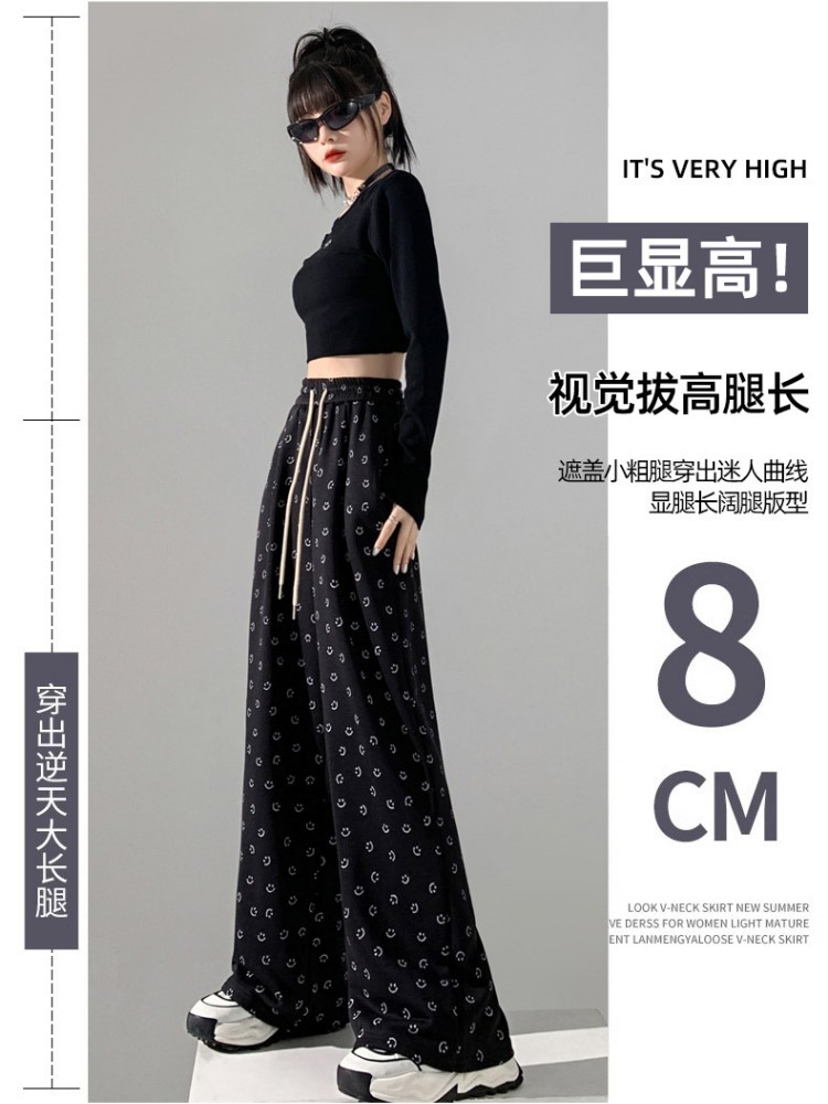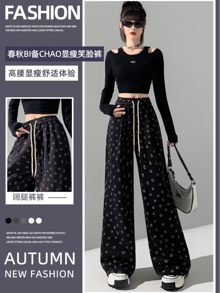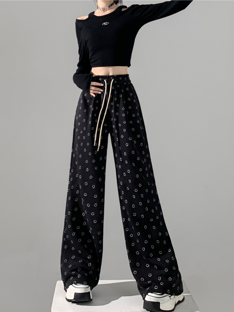 美式复古笑脸印花运动裤女春秋季慵懒风阔腿裤高腰显瘦拖地休闲裤