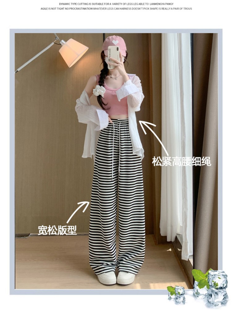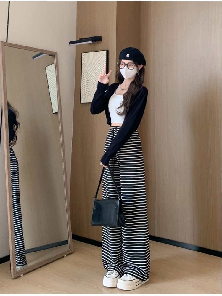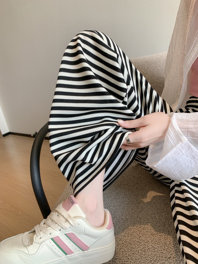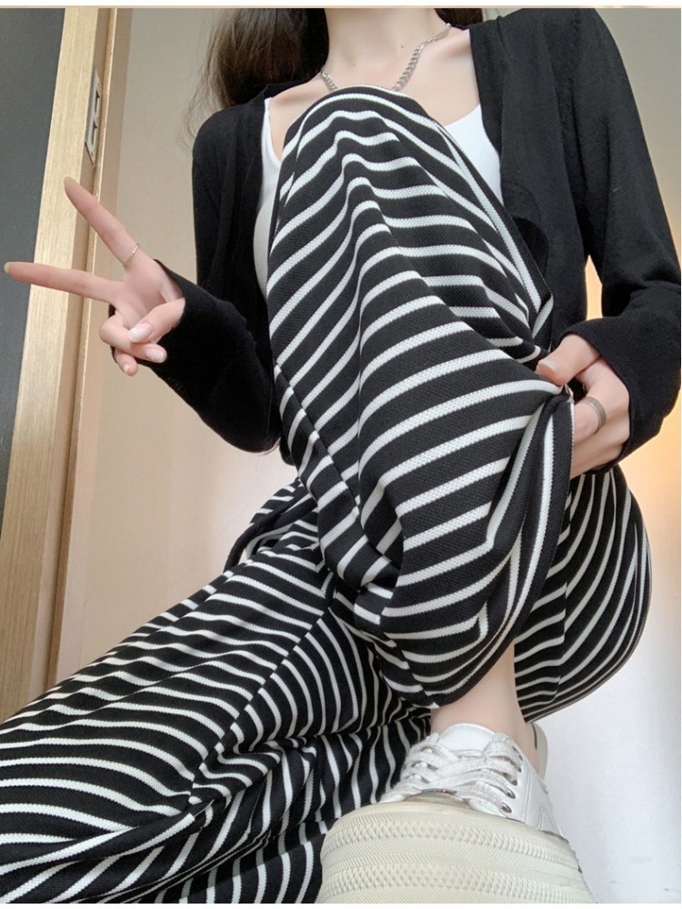 慵懒风黑白条纹裤子女春夏秋季高腰垂感窄版阔腿裤直筒休闲长裤