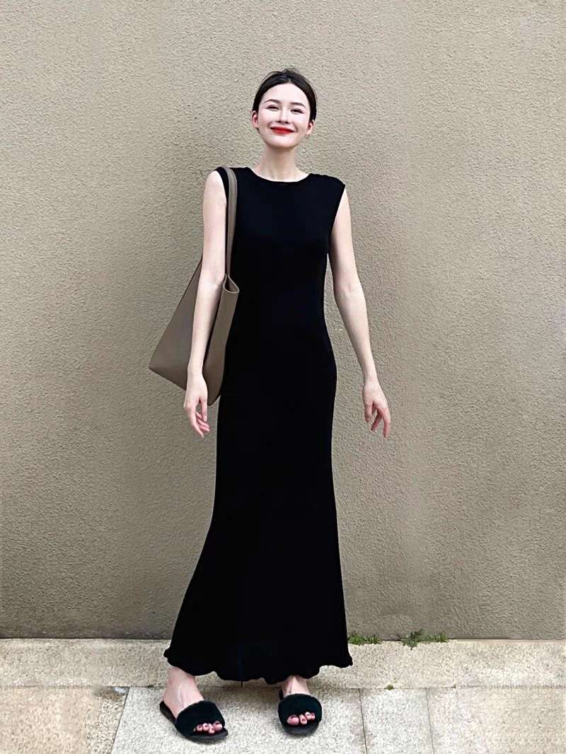 法式黑色修身连衣裙女夏高端精致赫本风长裙漂亮气质开叉背心裙子