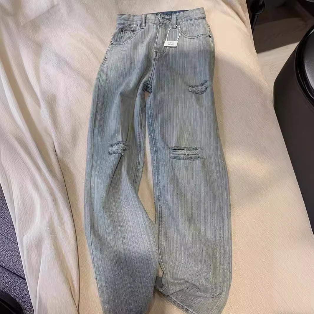 大码复古破洞牛仔裤女夏季高腰显瘦宽松百搭垂感直筒阔腿拖地裤子