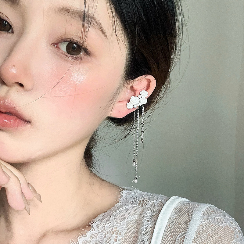 精致超仙白玫瑰珍珠流苏耳夹小众设计感气质花朵无耳洞耳骨夹耳饰