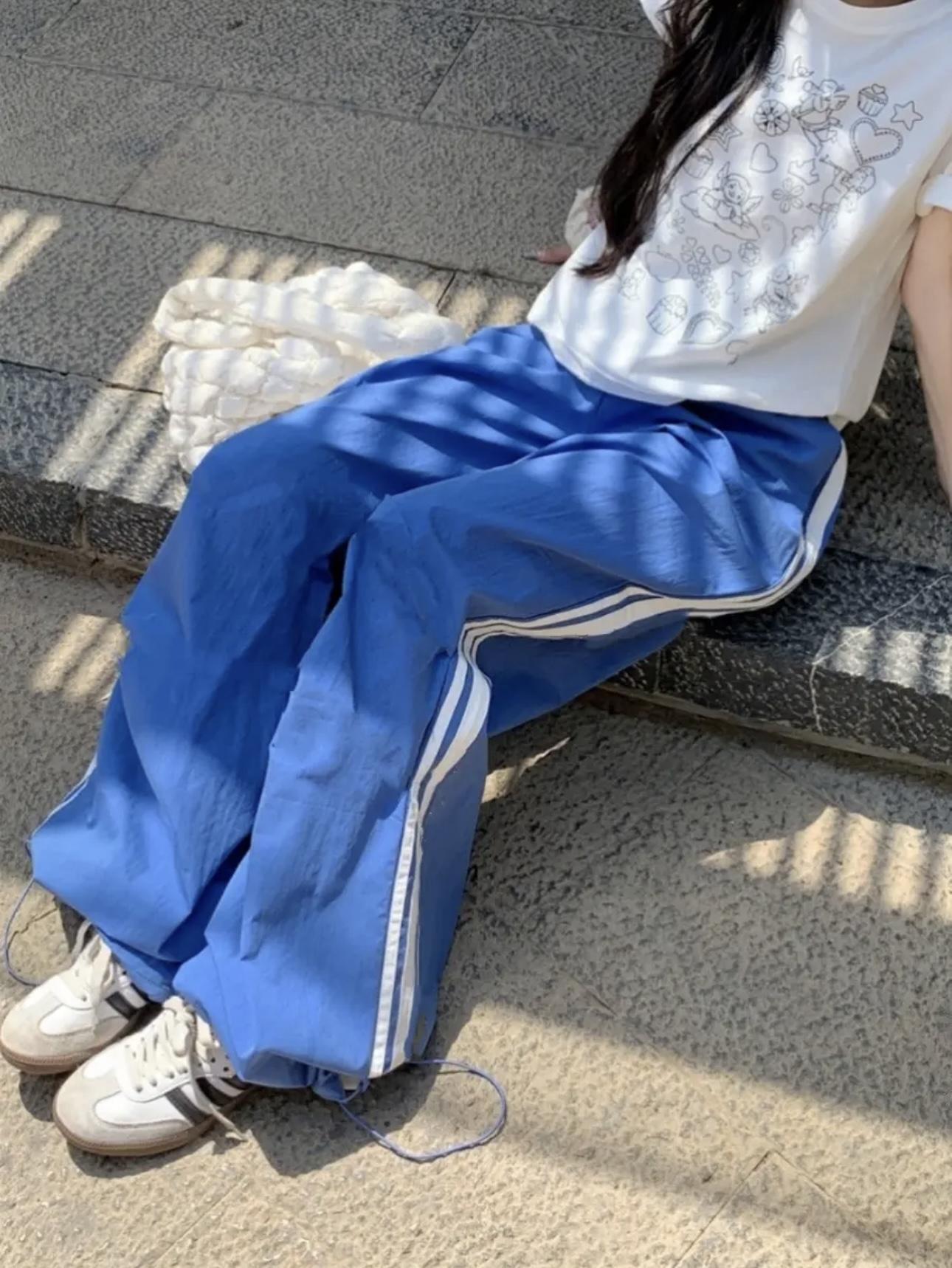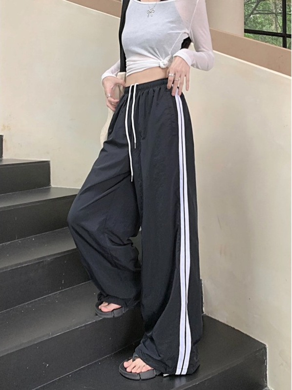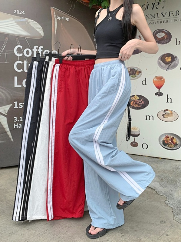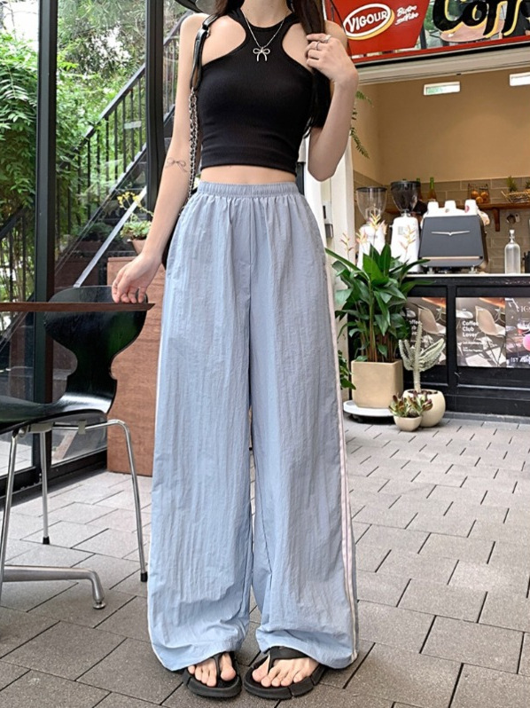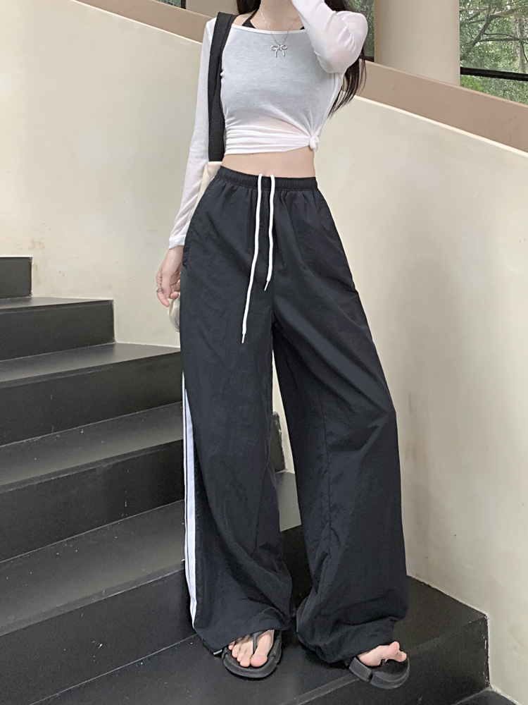 美式撞色两条杆速干阔腿裤女夏季新款高腰宽松显瘦拖地休闲裤