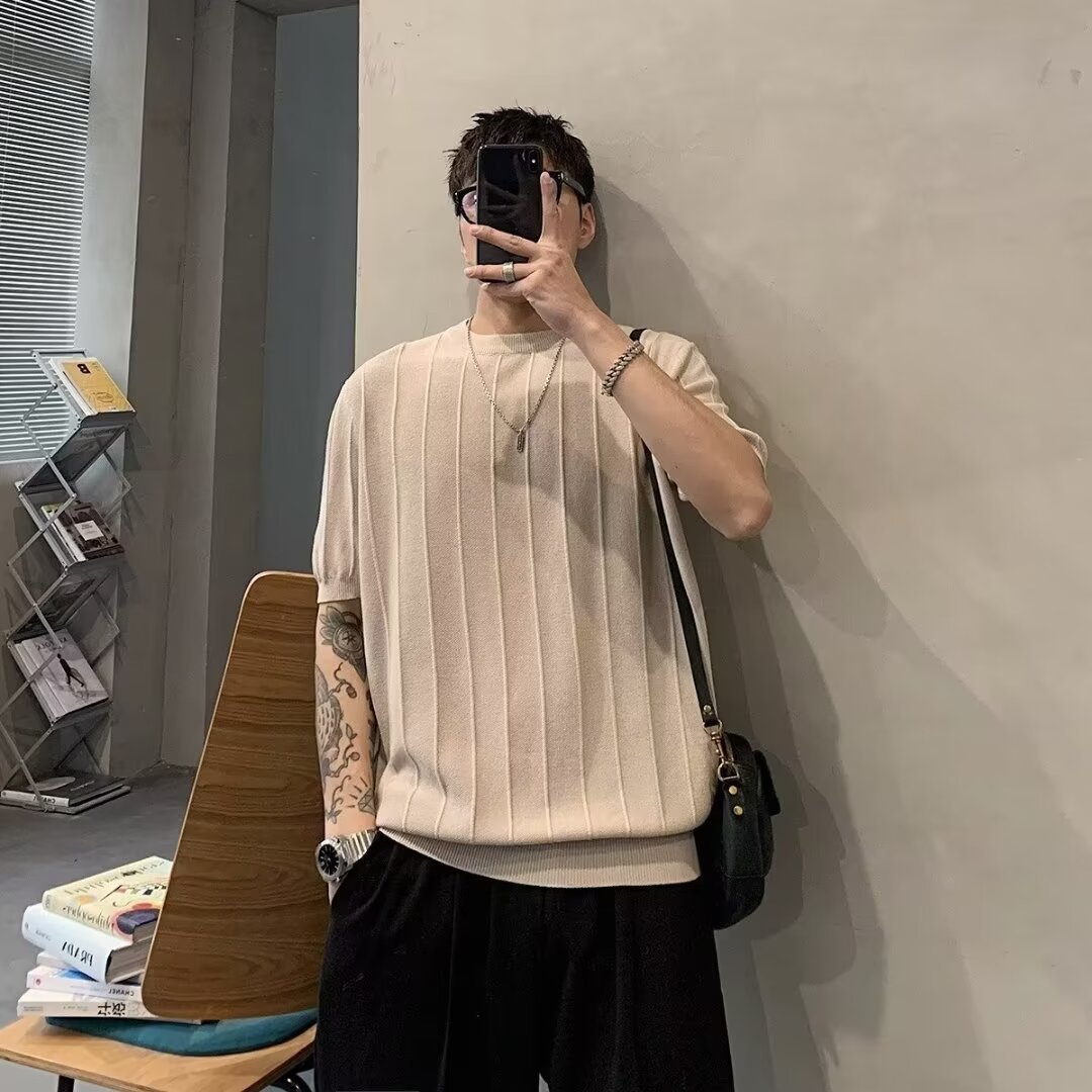 高级品质男装短袖T恤衫男夏季针织条纹体恤时尚休闲透气轻熟上衣
