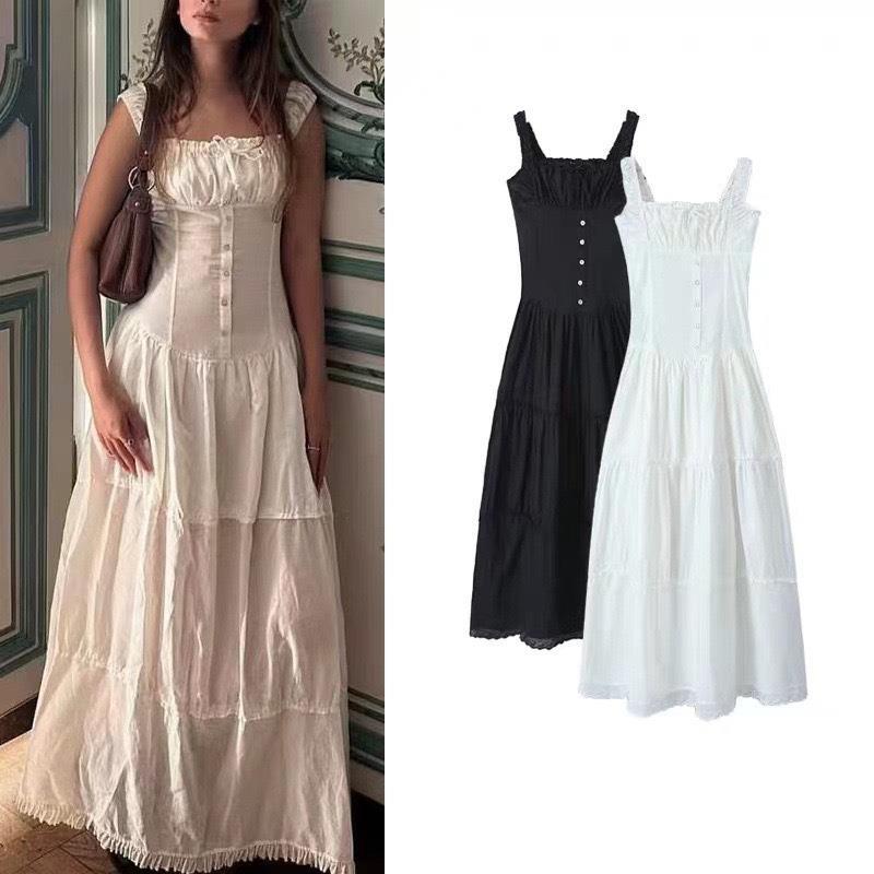 法式复古方领褶皱收腰胸前系带连衣裙女少女修身拼接木耳边长裙夏