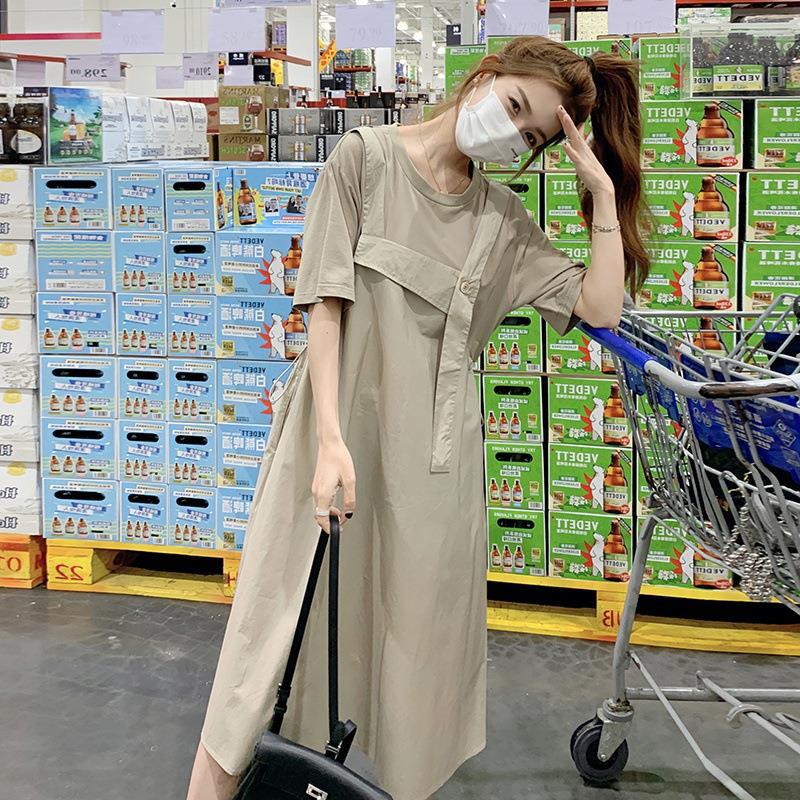 实拍宽松圆领轻复古抽绳收腰显瘦洋气灰卡其拼接假两件背带连衣裙